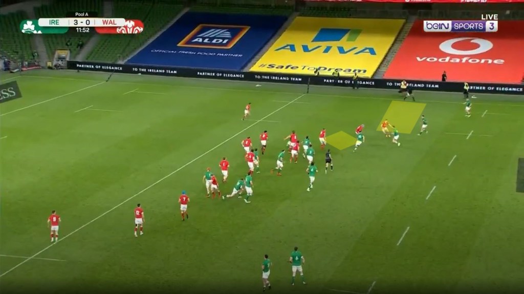 The onus is on Ireland to make sure that the inside defender is back up on their feet quickly after every collision because Wales won’t hesitate to target this space again after profiting from it as greatly as they did against the Azzurri. This type of play suits mobile, dextrous forwards such as Justin Tipuric down to the ground, and even though Wales’ wide movements need refinement, they can still hurt opposition defences with the kind of interplay shown above.
