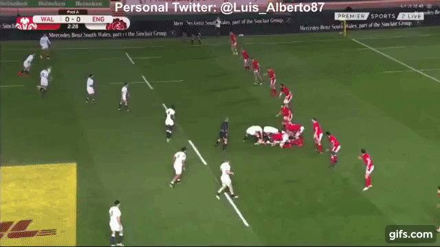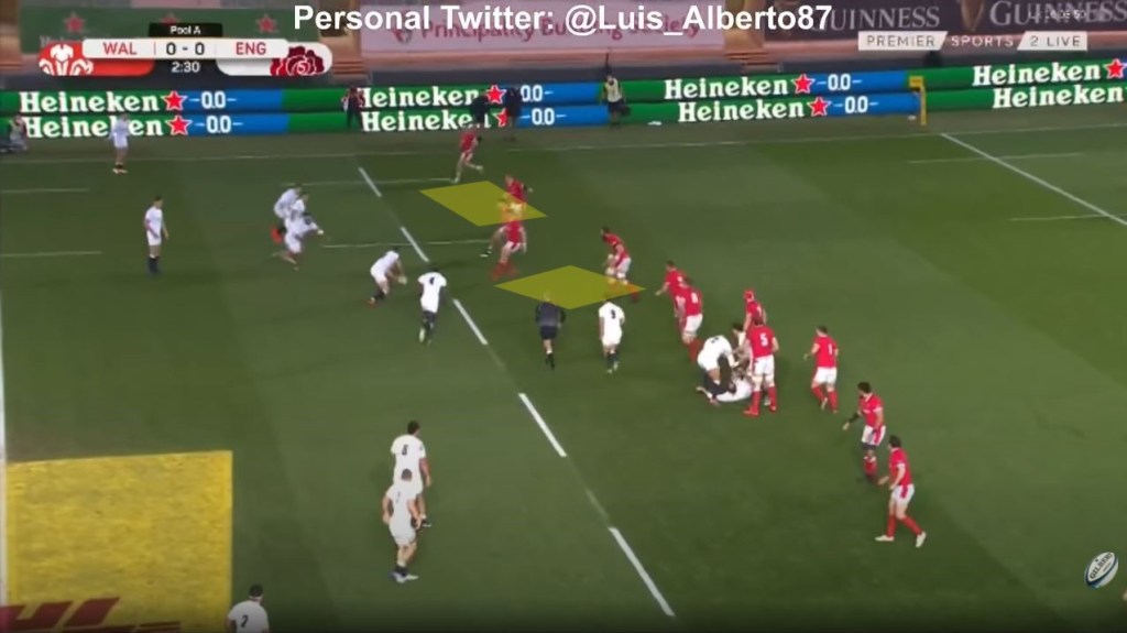 If we freeze-frame the clips above when the ball gets to first-receiver, you can see how the lack of synchronisation between the Welsh defenders produces big gaps: