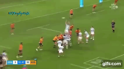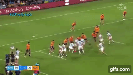 Defensive synchronisation is a problem for Argentina, even in the early stages of games. Their second fixture against Australia this year was a prime example of this, where not all of their players seemed to be aware of the spaces either side of them, leaving gaps that the Wallabies were quick to capitalise on: