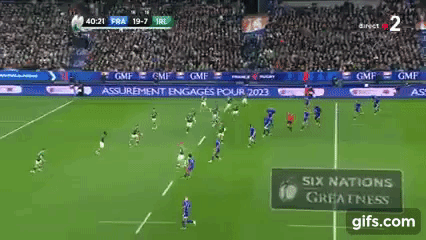 Joey Carbery took advantage of the space in behind the edge of the French blitz defence, too, with this well-weighted kick, which France did well to deal with, but were showing signs of creaking under pressure nonetheless: