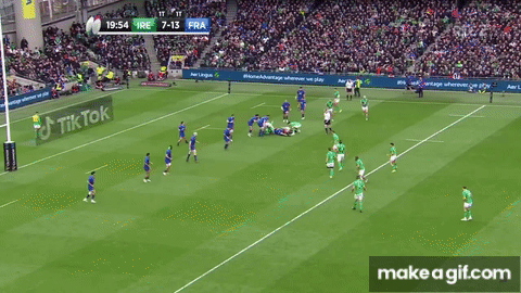 While Ireland’s work with ball in hand was impressive, a big part of the reason why they were able to put France on the back foot was the fatiguing effect of their kicking game. Pre-match, I pointed out France’s difficulties with high ball-in-play times, and Ireland clearly identified this as something that had to be a cornerstone of their strategy. Their use of the boot was key to their victory, with long punts in the field of play from Ireland being regular features of the first half, preventing the French forwards from taking a breather on their way to lineouts: