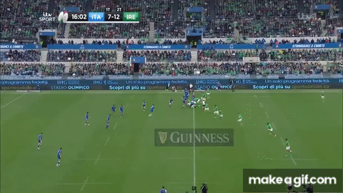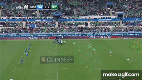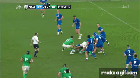 From the end of the second half, Italy’s defence in the wider channels was starting to cause Ireland some consternation, and after Pierre Bruno’s intercept, Ireland recognised the need to avoid letting them make big plays in this area, so they stated working them tighter the fringes with shorter-range passes:
